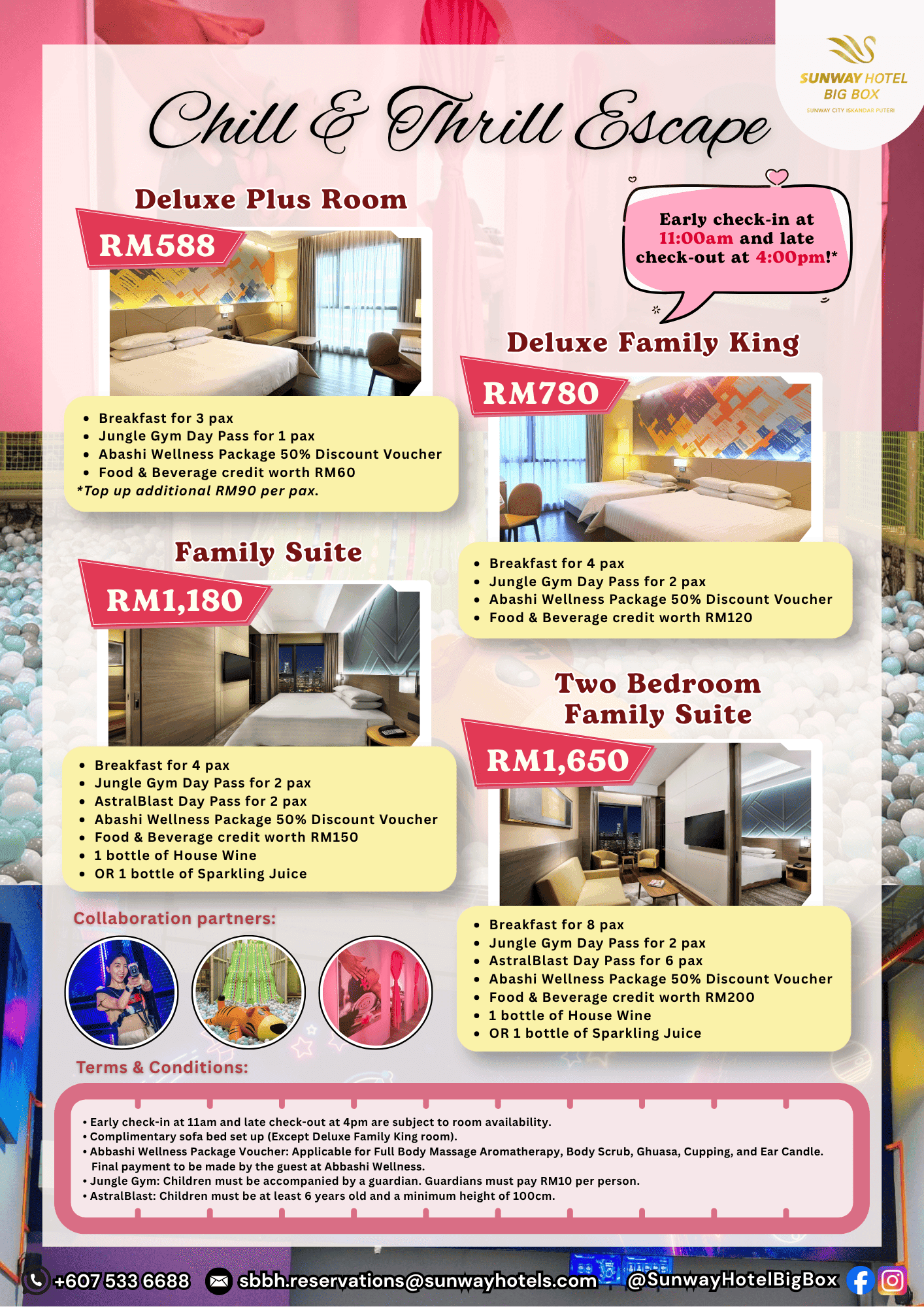 Make the most of your getaway with early check-in at 11:00am and late check-out at 4:00pm, more time to stay, play, and relax at Sunway Hotel Big Box!