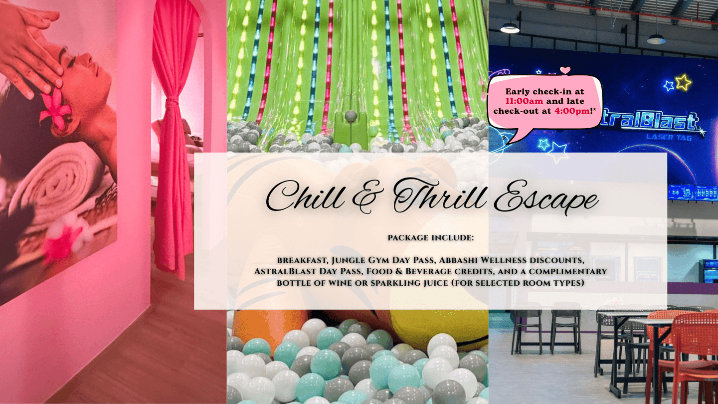 Choose the perfect room for your family and enjoy exciting perks like breakfast for up to 8 pax, Jungle Gym Day Pass, Abbashi Wellness discounts, AstralBlast Day Pass, Food & Beverage credits, and even a complimentary bottle of wine or sparkling juice for selected room types!