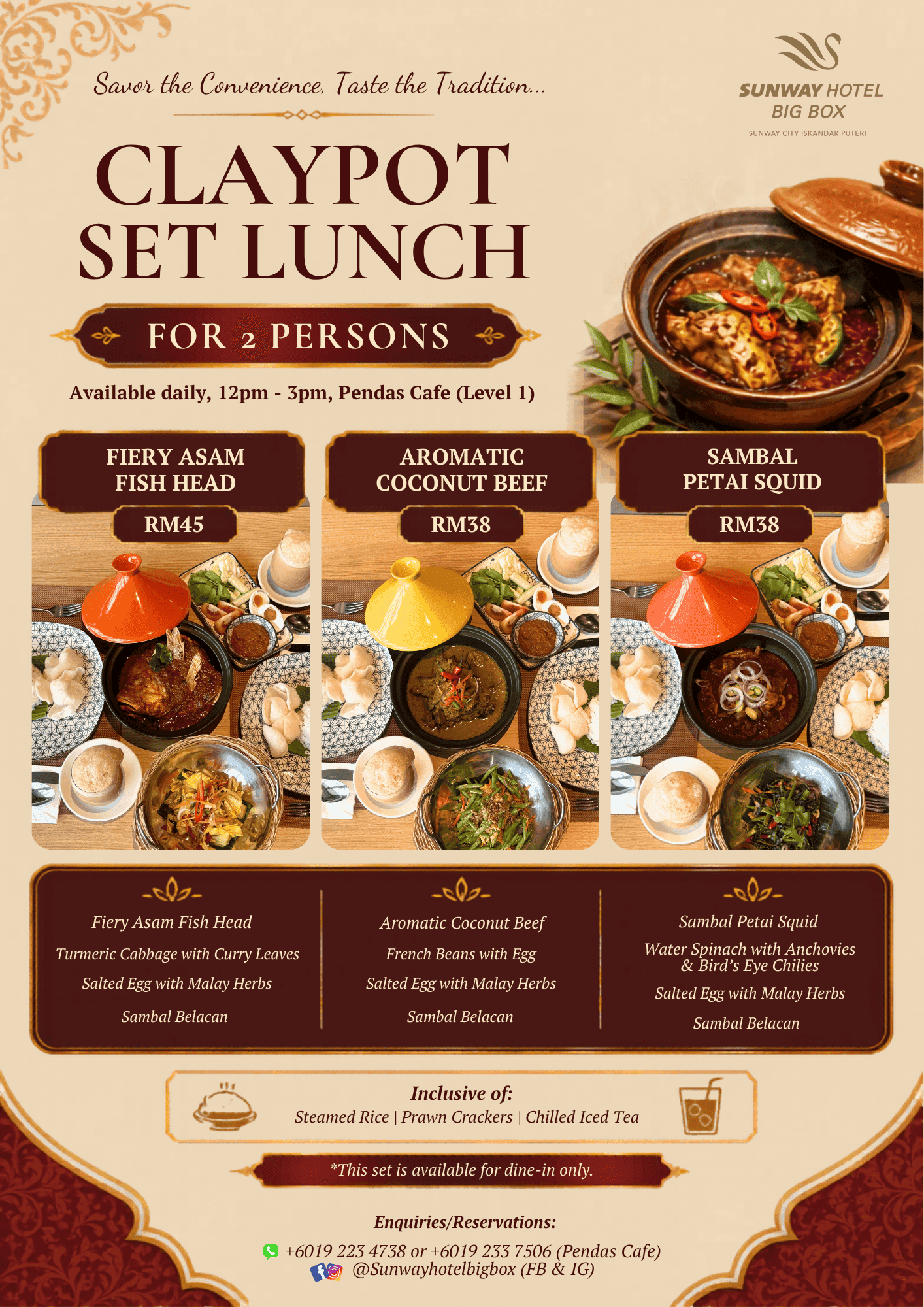 Indulge in our Claypot Set Lunch for 2, thoughtfully curated for a satisfying and flavourful midday experience. Perfect for sharing, each set brings together bold local favourites and comforting classics.