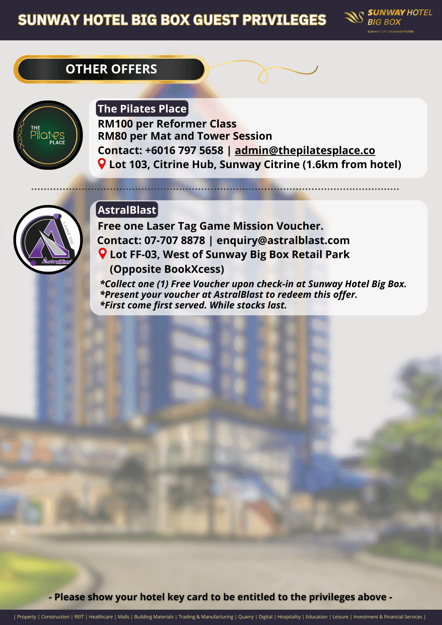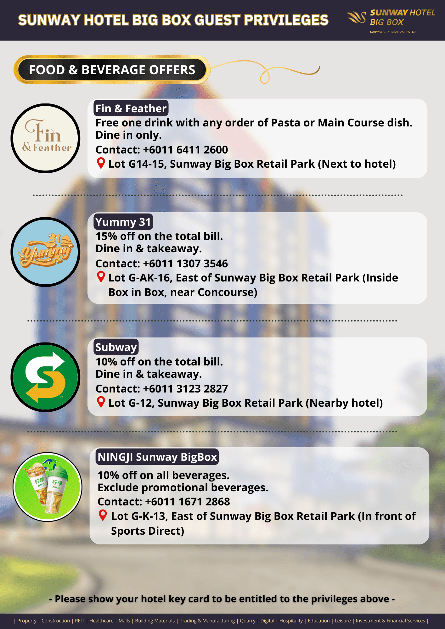 Just flash your room key and enjoy special deals from our awesome tenants around the hotel. Whether it’s shopping, dining, pampering or a little thrill, we’ve got your stay covered with surprises all around!