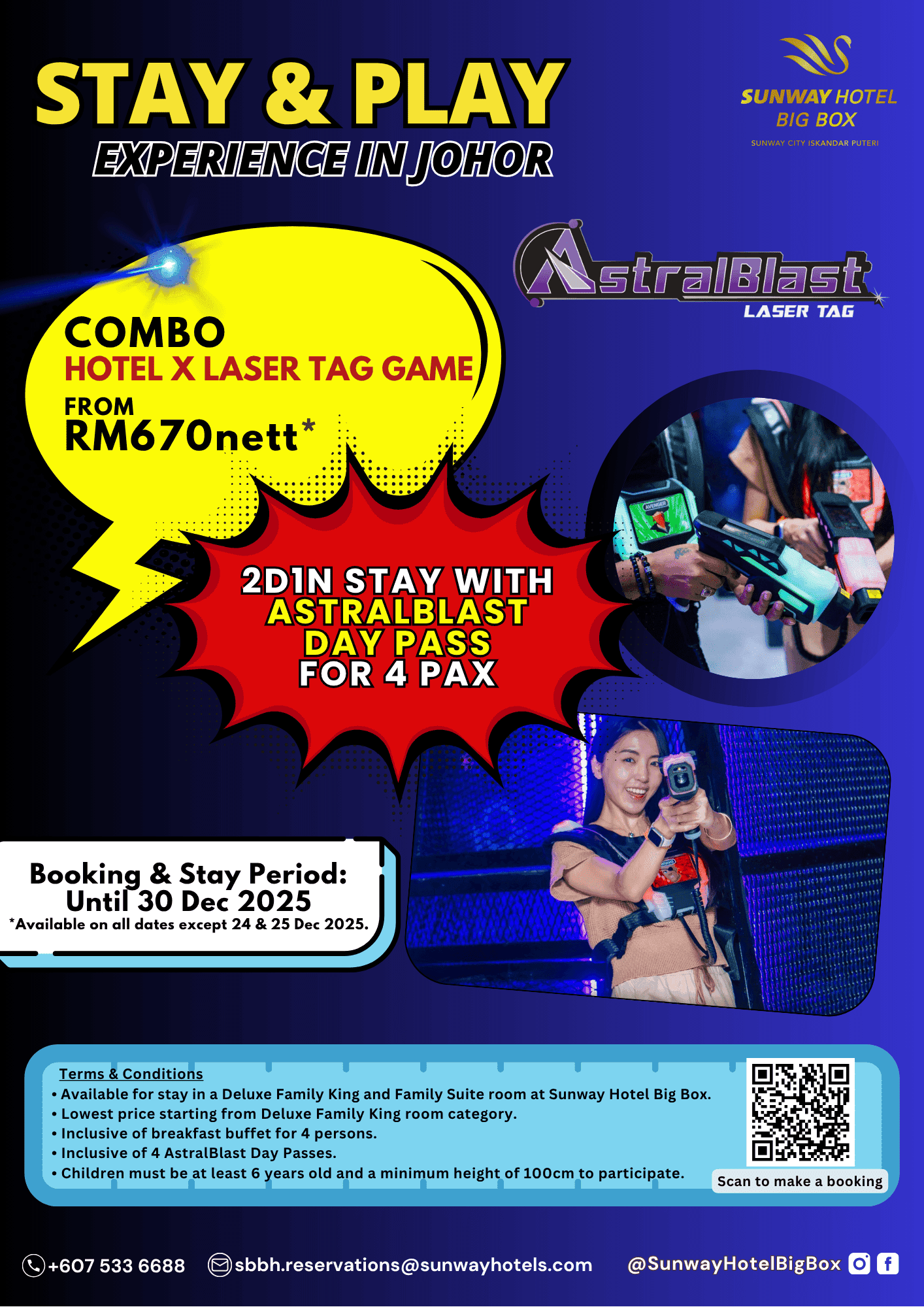 Looking for the ultimate family fun getaway in Johor, Malaysia? Stay and play with AstralBlast - the perfect combo of comfort and laser tag excitement! Grab this limited time only special rates and enjoy special complimentary add-ons such as breakfast for your tenure of stay.