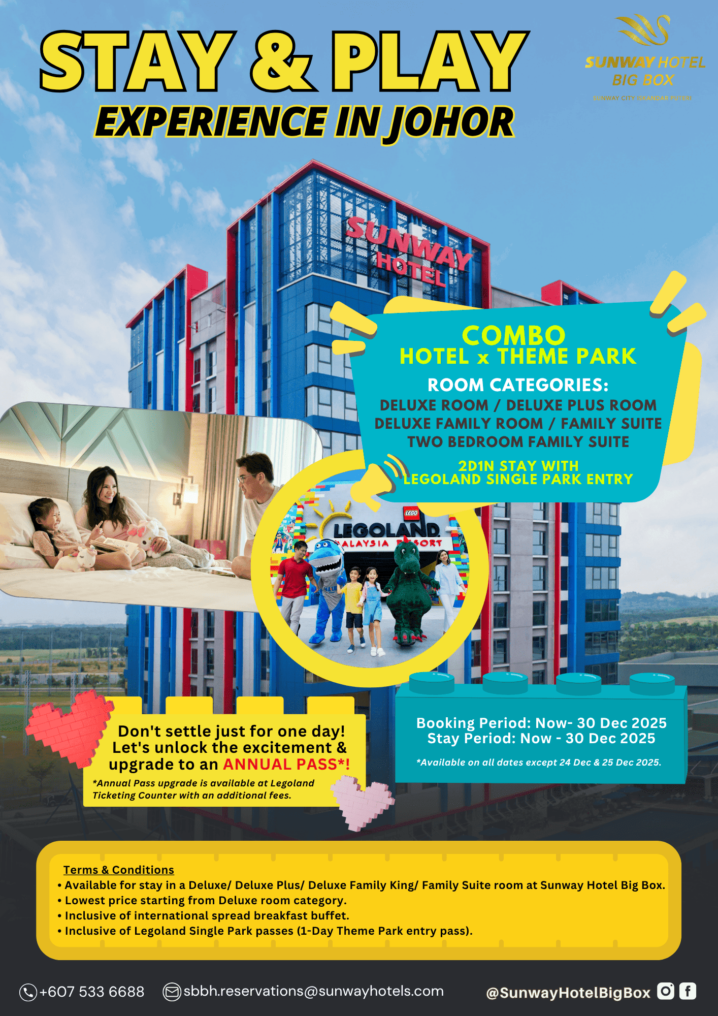 Create history with us by being among the first of our guests to enjoy this Legoland package. Grab this limited time only special rates and enjoy special complimentary add-ons such as breakfast for your tenure of stay.