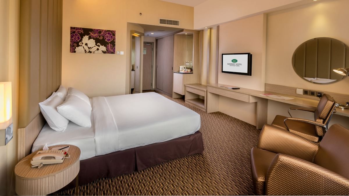 The Premier King room combines a sophisticated design with comfort, featuring a king-sized bed and enhanced in-room offerings. Enjoy premium minibar selections and exclusive placement on higher floors for a premium experience.