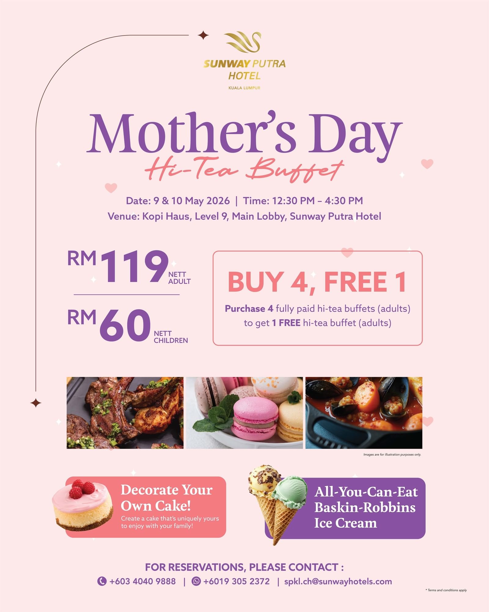 Terms and Conditions Apply : Purchase 4 fully paid hi-tea buffets (adult) to get 1 complimentary hi-tea buffet (adult)