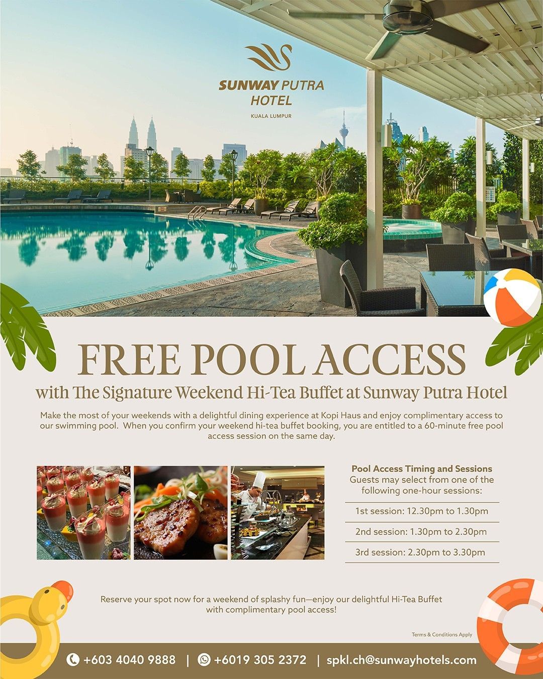 When you confirm your weekend hi-tea buffet booking, you are entitled to a 60-minute free pool access session on the same day.