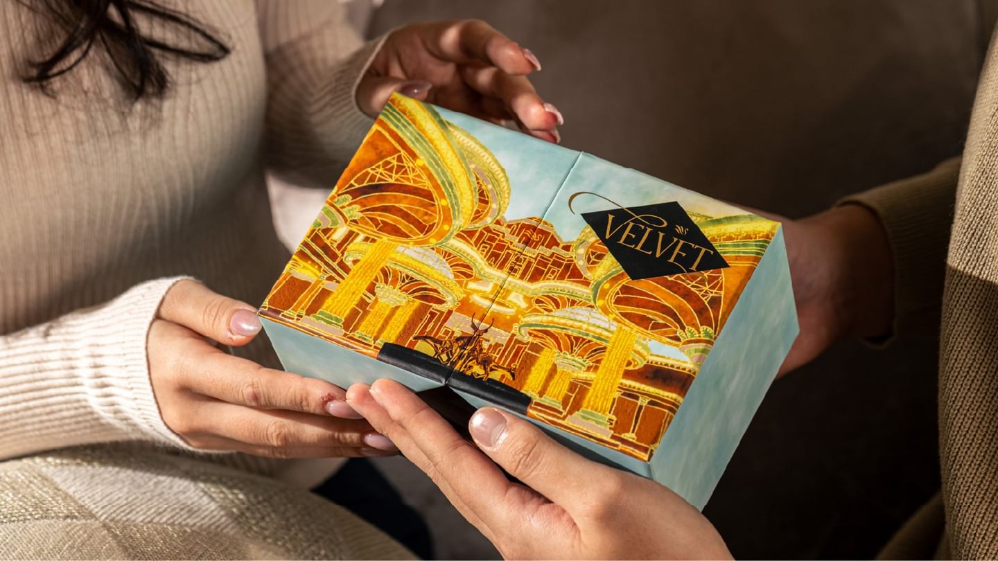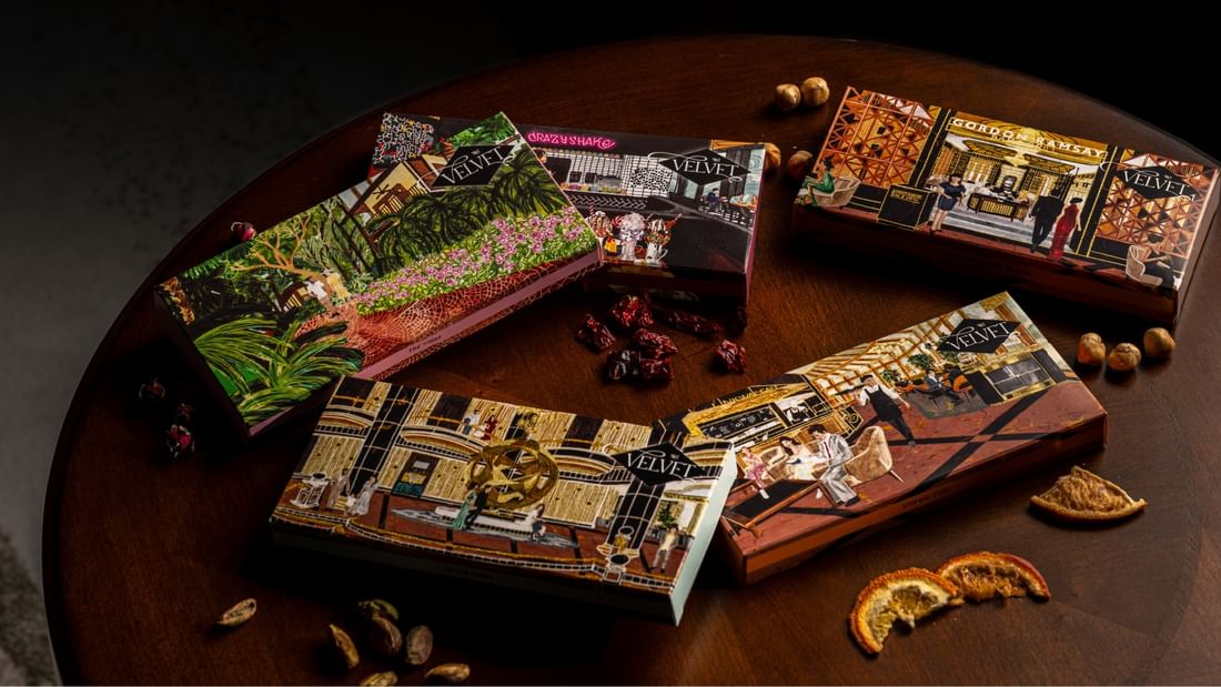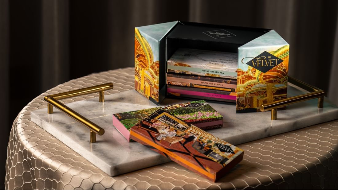 Handcrafted in our kitchen, the Velvet Chocolate Collection brings together the silky richness of premium chocolate with the delicate crisp of kunafa. Each box features hand-drawn illustrations of Sunway Resort Hotel’s iconic spaces, adding a touch of artistry to every gift.