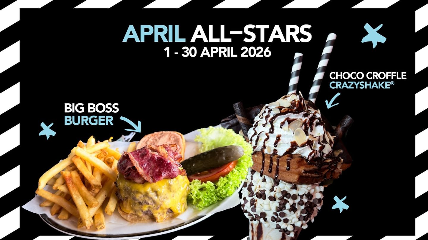 Big flavours, bigger cravings this April at Black Tap Craft Burgers & Shakes. Meet our April All-Stars, from the Big Boss Burger loaded with double prime patties, melty cheese and crispy beef bacon, to the Choco Croffle CrazyShake stacked high with sweet, chocolatey indulgence.