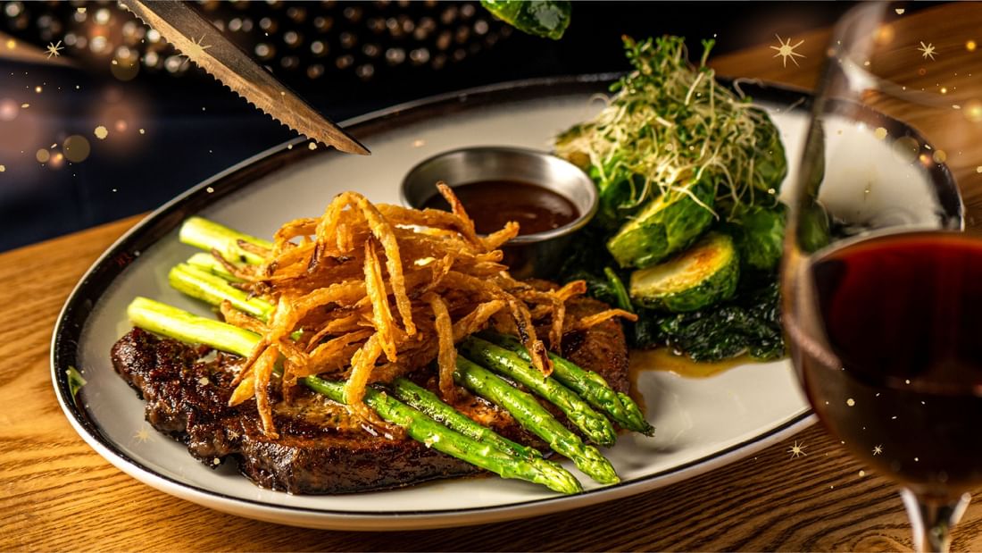 Served with sautéed spinach, brussels sprouts, asparagus, steak sauce and steak butter. Paired with a complimentary glass of house wine.